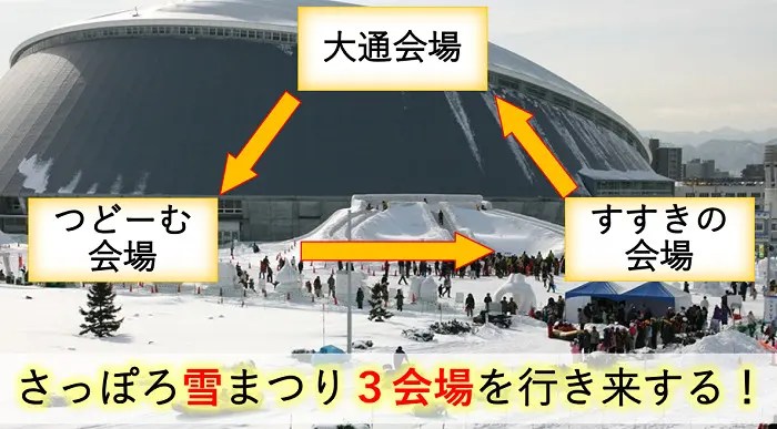 上からつどーむ会場、札幌駅、大通会場、すすきの会場が並んでいます。