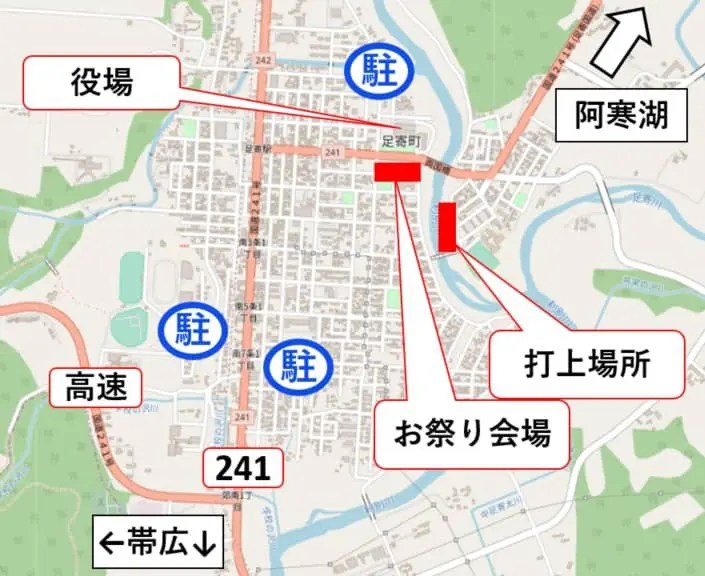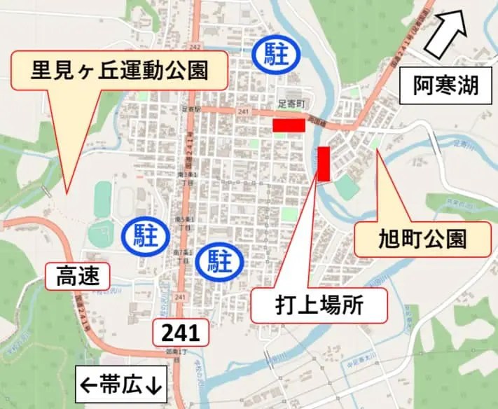 - 開催地:足寄町内利別川両国橋河川敷(花火打上会場)