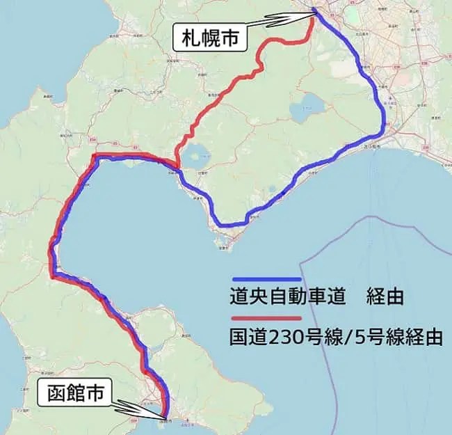 一般道利用(約4時間42分)札幌市内から国道230号線で中山峠、洞爺湖を抜けていくのが一番近いです。海岸線まで出たら函館まで一本道です。