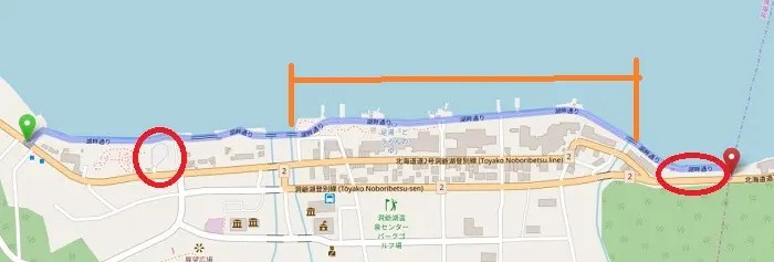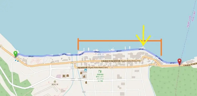 左から右へ青い線でなぞられています、これは湖畔通りといって、湖岸の整備された歩行路です。