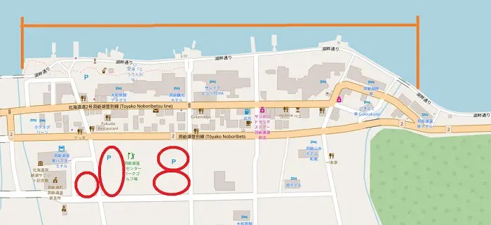 洞爺湖では観光客のために、町の中心部に4つの無料駐車場が用意されていています。全部で200台分になります。