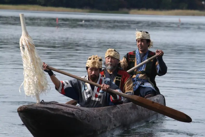 まりもを迎える儀式は阿寒湖岸から湖へアイヌの青年が丸木舟に乗って天然のまりもを迎えに行きます。そして、まりもはアイヌの長老に手渡され、タイマツを手に持ち行進します。