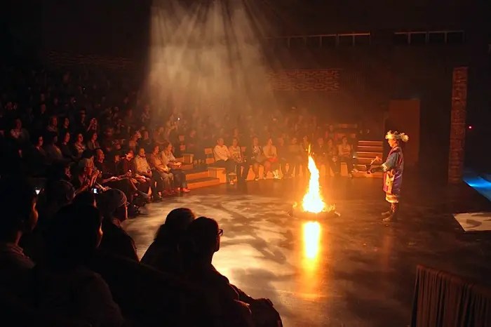 着火式(カムイノミ・神への祝詞)から始まり、アイヌ民族の楽器による演奏と古式舞踊で織りなす舞台です。