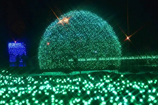 クリスマスオーナメントの中に入り込んだような楽しさを演出していますね。グリーンを基調としたグランドイルミネーションが見る人を癒しの世界へと導きます。