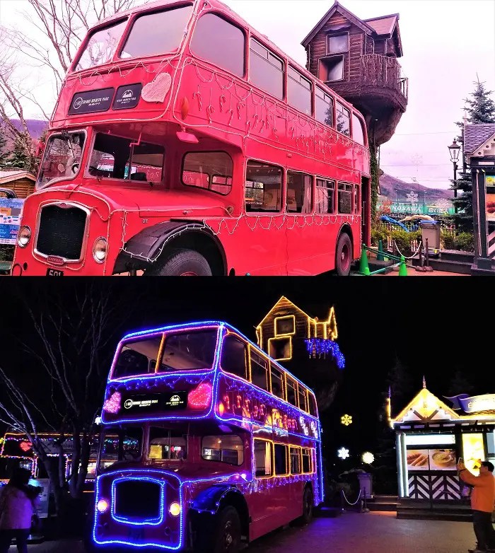 まるでイギリスのような真っ赤な二階建てバス。