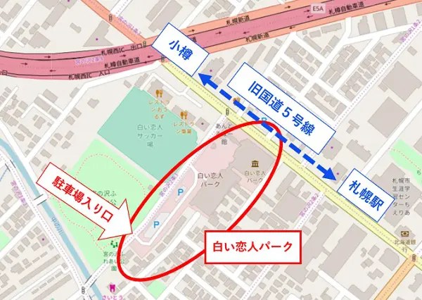 2番出口、5番出口を出て坂の上の方に登っていくと大きな片道2車線道路に出ます。右を見ると白い恋人パークが見えます。 - 駐車場:無料、450台(屋内駐車場)
