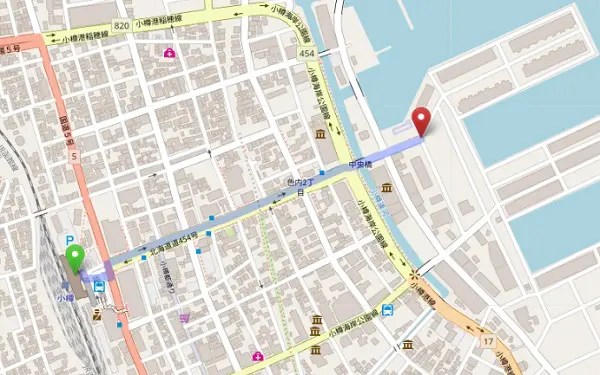 JR小樽駅から坂道を下に向かって真っすぐ歩けば15分程で到着します。