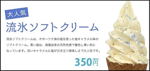 オホーツク流氷館の1Fにあるカフェで、ここの流氷館でしか食べることのできないオホーツク海の塩を使った塩キャラメル味の「流氷ソフトクリーム」が大人気です。