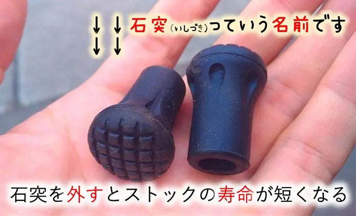 登山用ストックにおける石突とはゴムキャップと外したときの金属の先端部のことを言います。