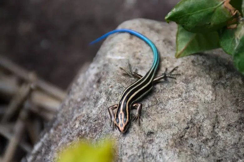 色からして二種類いるように見えますが大体ニホントカゲで、しっぽが青や紫で凄く綺麗なのがニホントカゲのメスです。