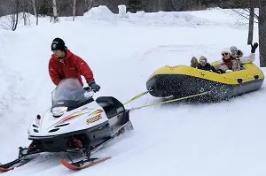 川下り用のラフティングボートに乗って雪上を滑る!スノーモビルが引っ張ってくれるので、なまら爽快です。